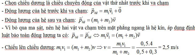 Một viên bi có khối lượng m1 = 0,5 kg đang chuyển động trên mặt phẳng ngang không ma sát với vận tốc v1 = 4 m/s đến va chạm với viên bi thứ hai có khối lượng m2 = 0,3 kg đang đứng yên. Sau va chạm, chúng dính vào nhau và chuyển động cùng vận tốc v. Tính vận tốc v của hai viên bi sau va chạm.