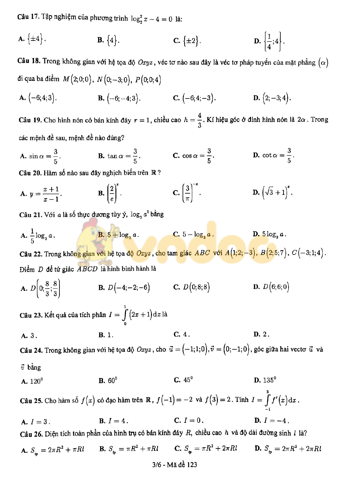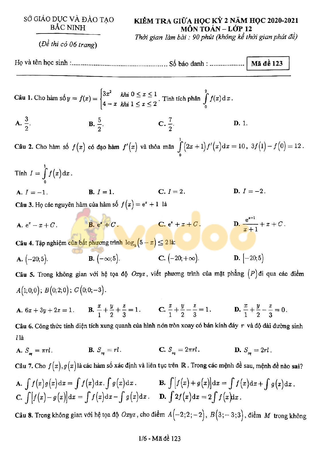 Mời các bạn tham khảo đề kiểm tra giữa kì 2 Toán 12 năm học 2020 - 2021 Sở GD&ĐT Bắc Ninh do VnDoc sưu tầm và đăng tải sau đây. Đề kiểm tra Toán 12 bao gồm 50 câu hỏi trắc nghiệm hệ thống kiến thức được học trong nửa đầu học kì 2 Toán 12, là tài liệu hữu ích cho các em học sinh tham khảo, chuẩn bị cho kỳ thi giữa kì 2 sắp tới đạt kết quả cao.
