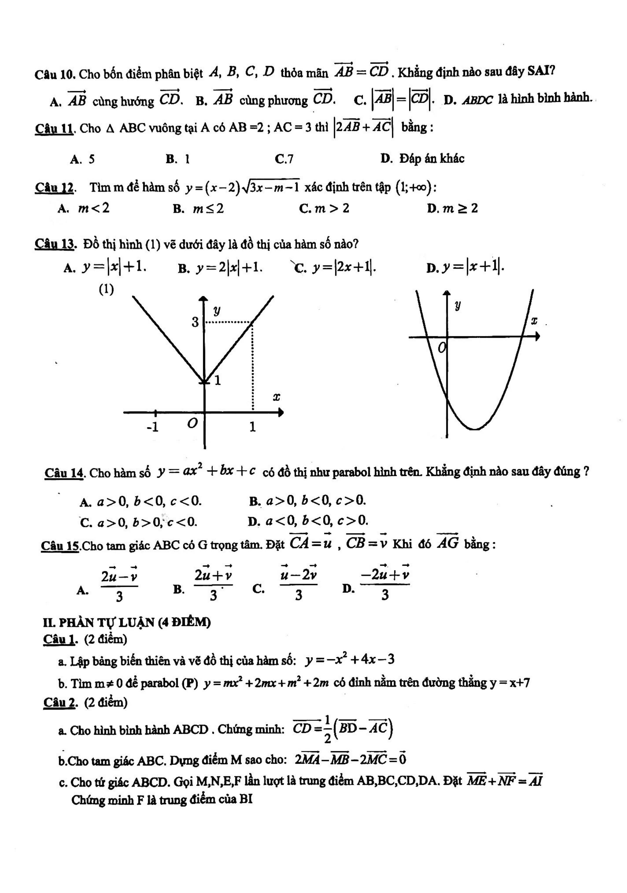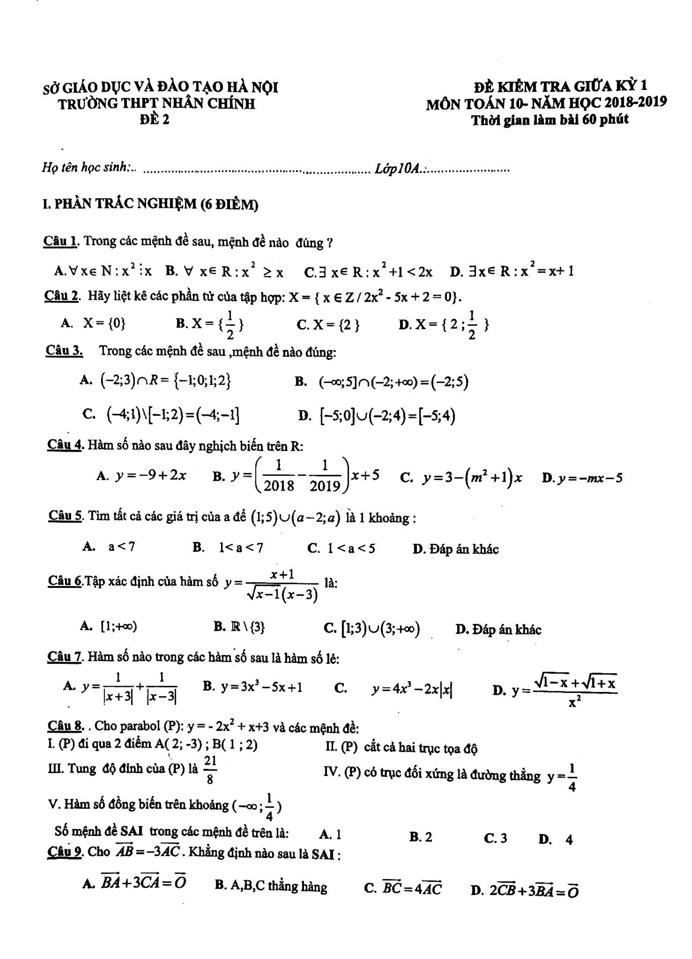 Đề kiểm tra giữa kì 1 Toán 10 năm 2018 - 2019 trường THPT Nhân Chính - Hà Nội