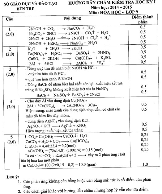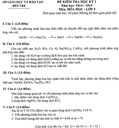Đề kiểm tra học kì 1 môn Hóa học lớp 9 năm học 2014 - 2015 tỉnh Bến Tre