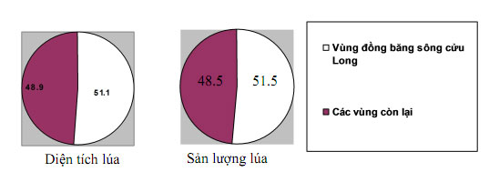- Vùng Đồng bằng sông Cửu Long chỉ chiếm 51.1% diện tích nhưng sản lượng lúa lại chiếm tới 51.5% của cả nước (0,5đ). Cho thấy năng suất lúa của vùng cao hơn năng suất lúa trung bình của cả nước. (0,5đ)