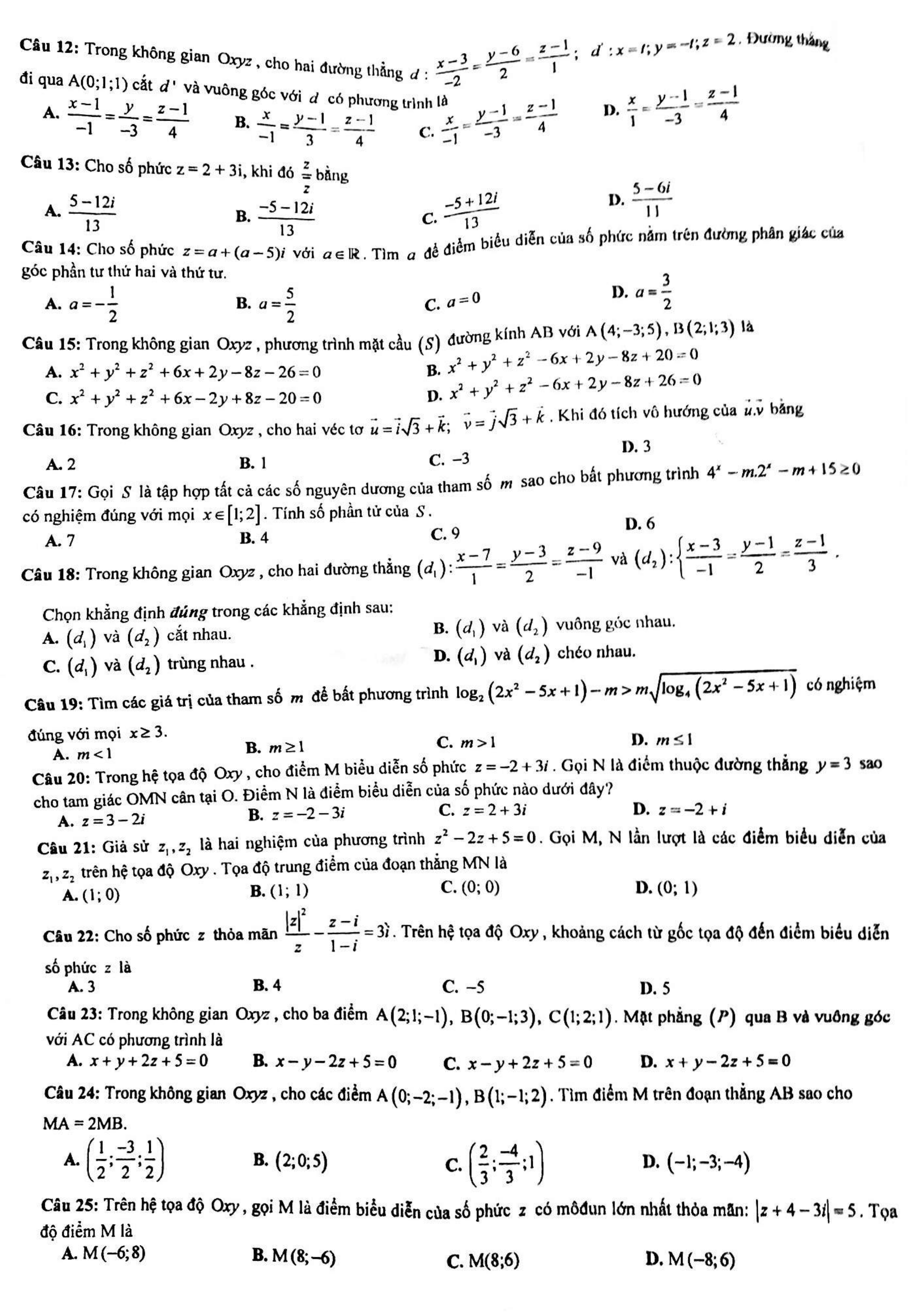 Đề kiểm tra học kì 2 môn Toán lớp 12