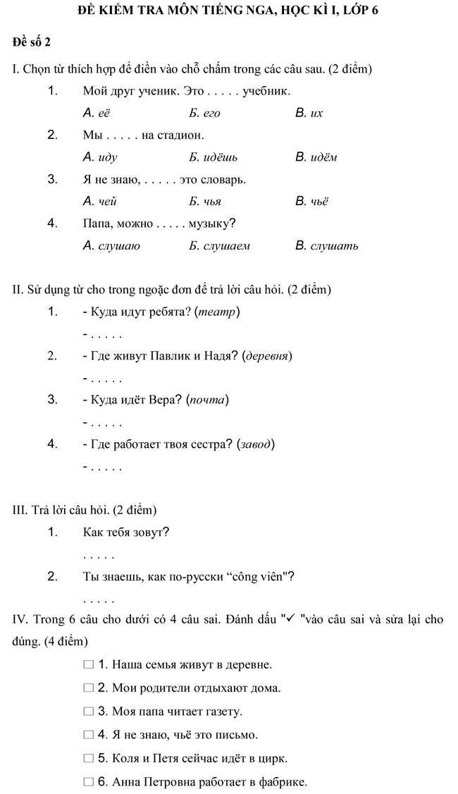 Đề kiểm tra học kì I dành cho học sinh THCS lớp 6 môn tiếng Nga - Đề số 2