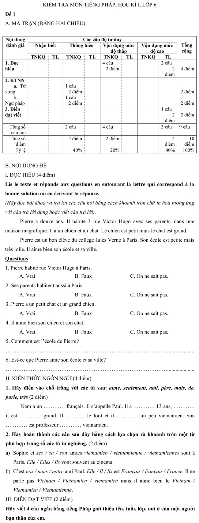 Đề kiểm tra học kì I môn tiếng Pháp dành cho học sinh lớp 6 - Đề số 1
