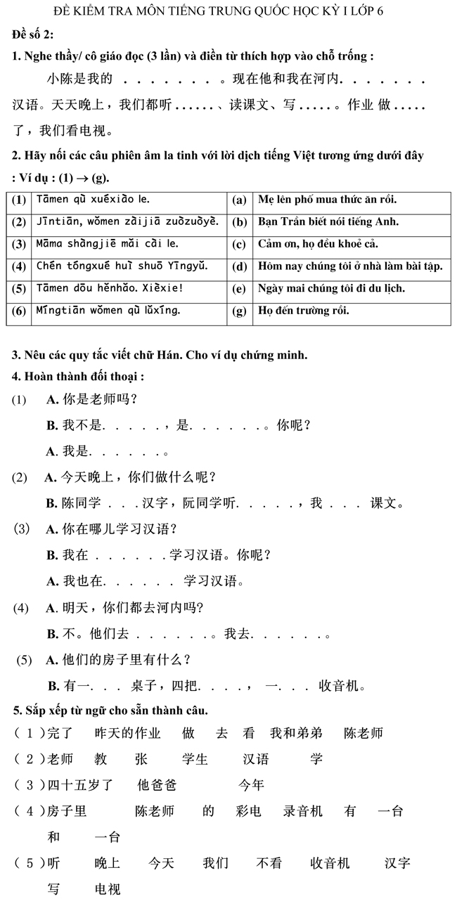 Đề kiểm tra học kì I lớp 6 môn tiếng Trung Quốc - Đề số 2