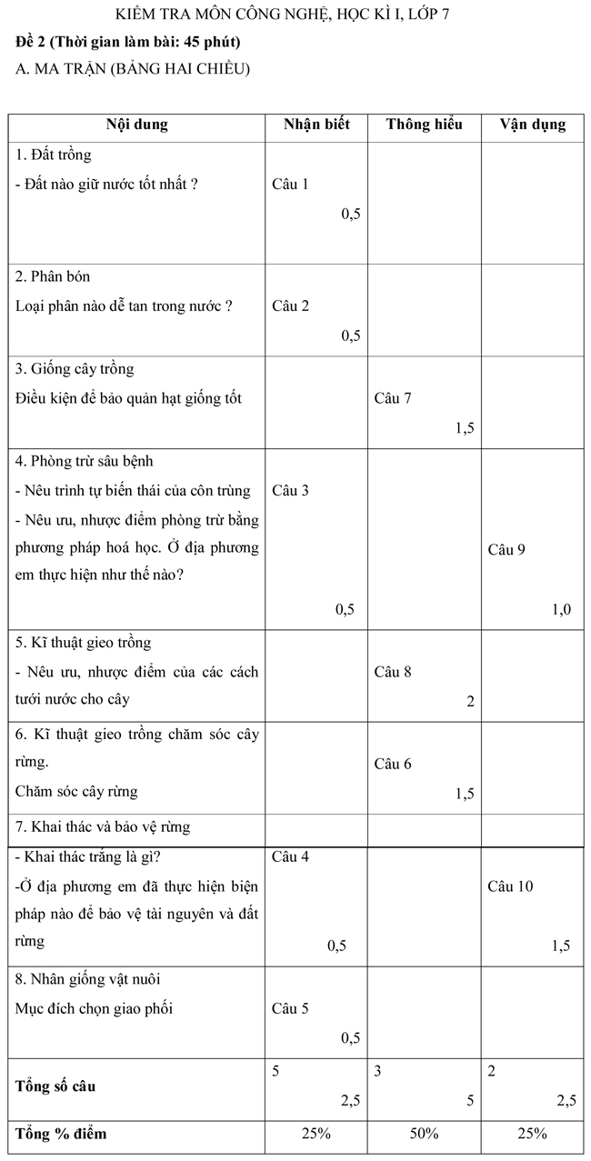 Đề kiểm tra môn Công nghệ học kì I dành cho học sinh THCS lớp 7 - Đề số 2