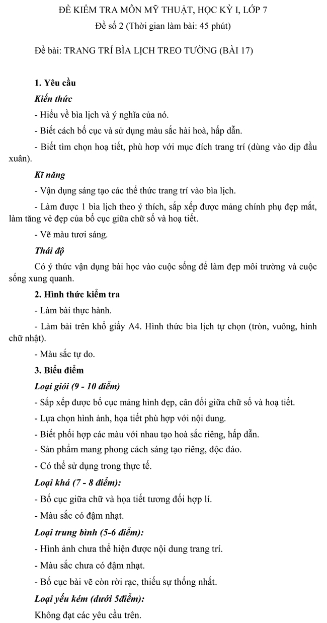 Đề kiểm tra học kì I môn Mỹ thuật dành cho học sinh THCS lớp 7 - Đề số 2