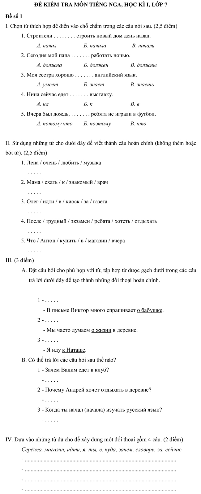 Đề kiểm tra học kì I môn tiếng Nga dành cho học sinh THCS lớp 7 - Đề số 1