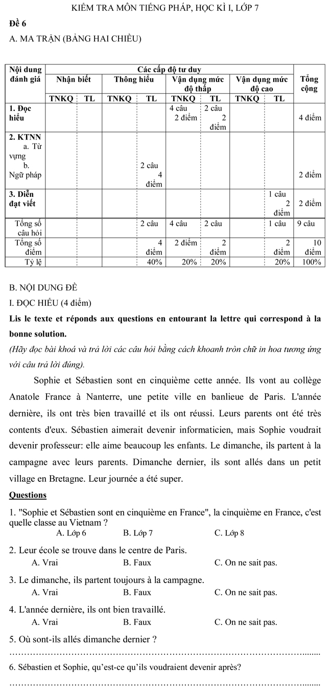 Đề kiểm tra học kì I môn tiếng Pháp dành cho học sinh THCS lớp 7 - Đề số 6
