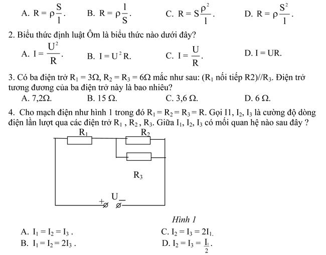 1. Công thức nào sau đây biểu diễn sự phụ thuộc của điện trở của dây dẫn vào chiều dài dây dẫn (l), tiết diện dây dẫn (S), điện trở suất của vật liệu làm dây ( ρ) là đúng?