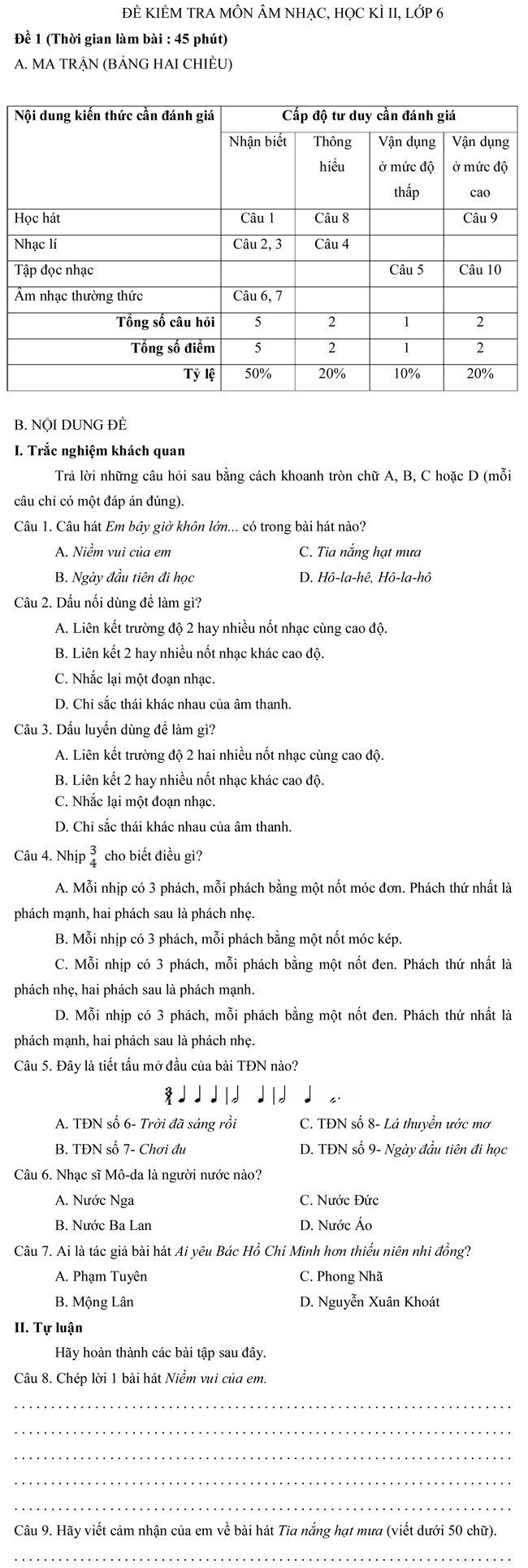 Đề kiểm tra môn Âm nhạc học kì II dành cho học sinh THCS lớp 6 - Đề số 1