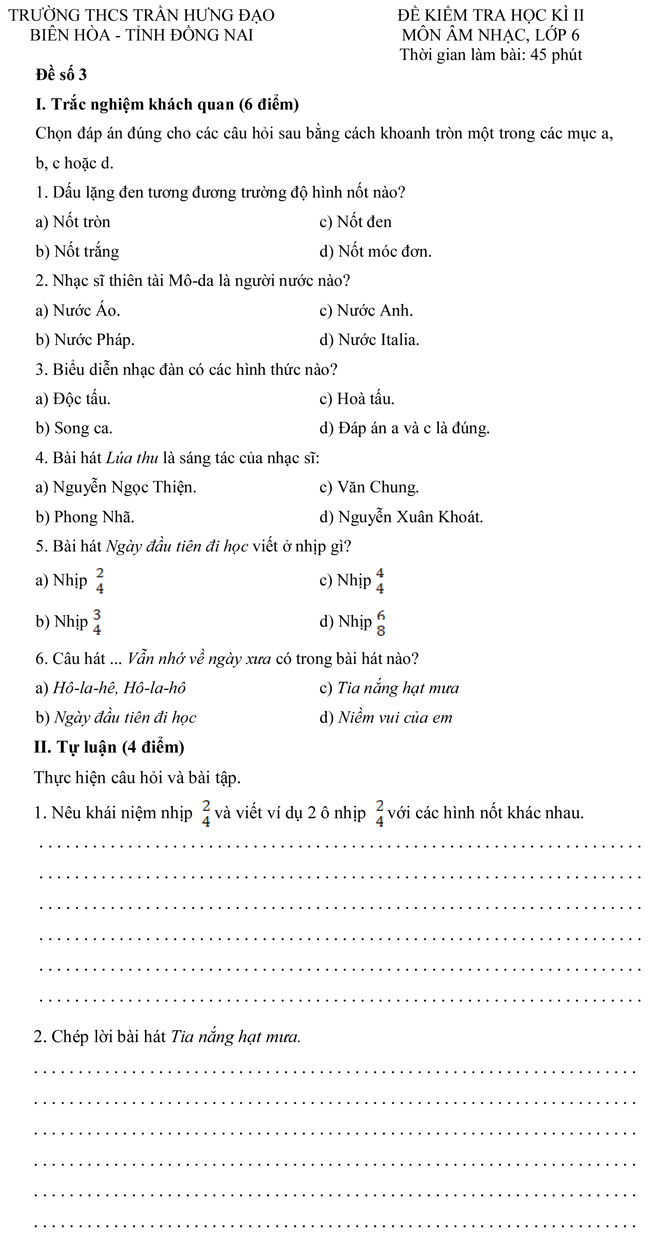 Đề kiểm tra học kì II lớp 6 môn Âm nhạc - Trường THCS Trần Hưng Đạo, Đồng Nai (Đề 3)