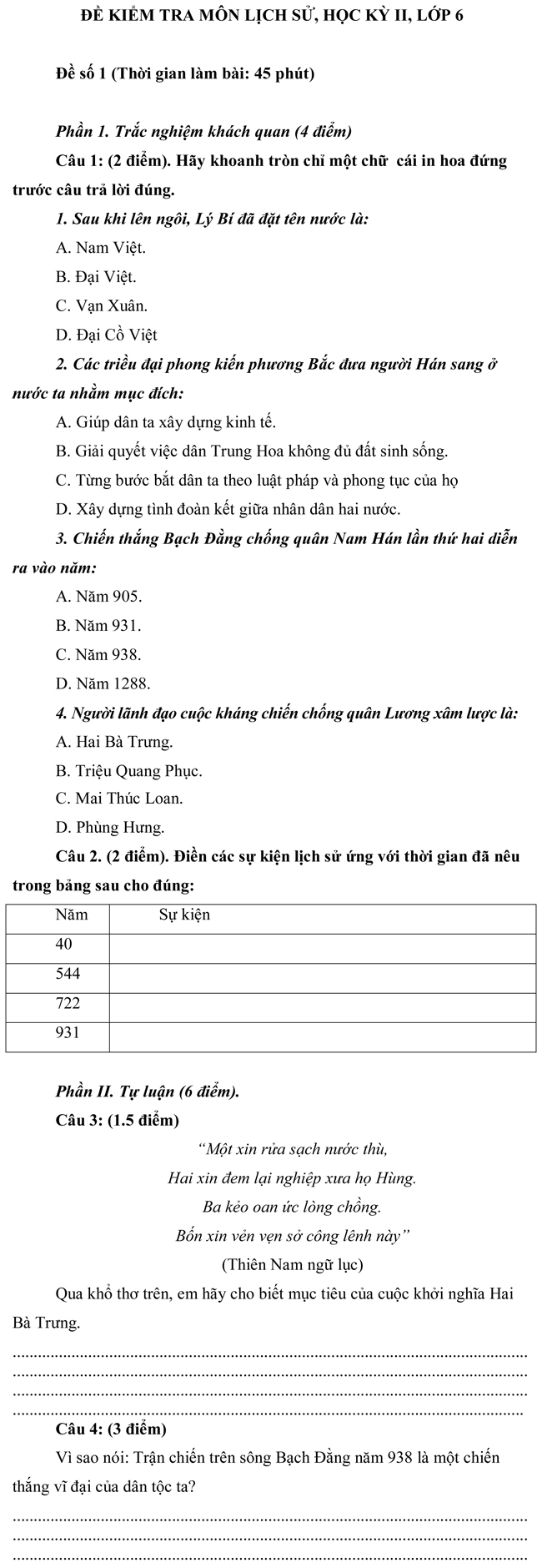 Đề thi học kì 2 lớp 6 môn Lịch Sử