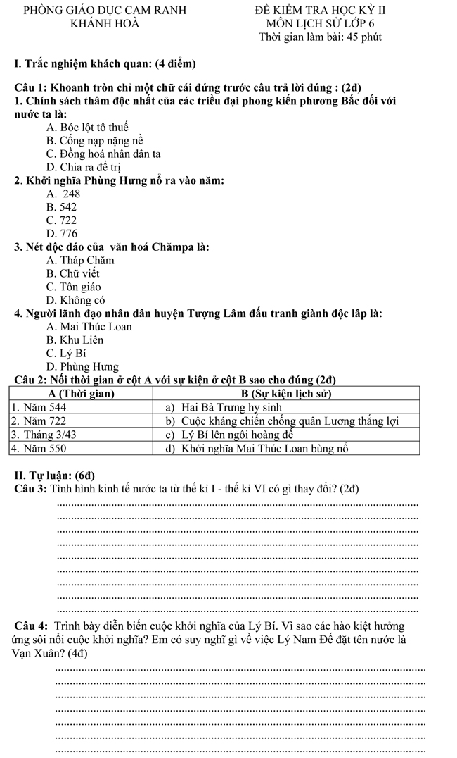 Đề kiểm tra học kì II lớp 6 môn Lịch sử phòng Giáo dục Cam Ranh - Khánh Hòa