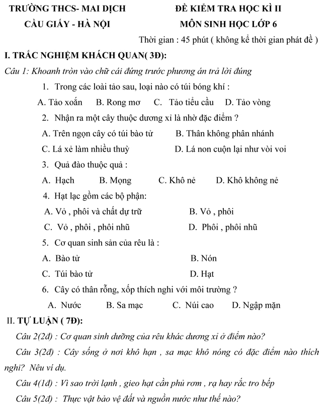 Đề kiểm tra học kì II lớp 6 môn Sinh học trường THCS Mai Dịch, Cầu Giấy - Hà Nội