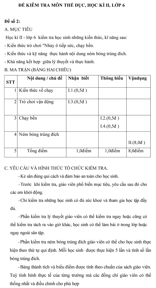 Đề kiểm tra học kì II dành cho học sinh THCS lớp 6 môn Thể dục - Đề số 2