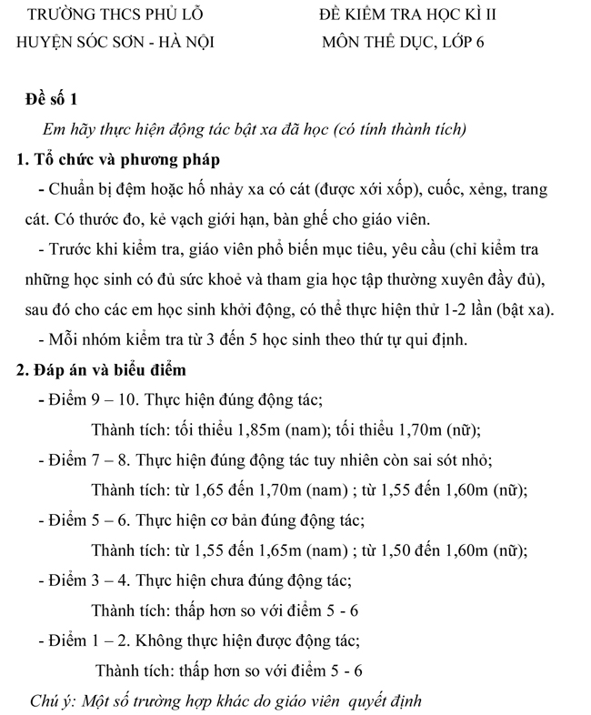 Đề kiểm tra học kì II lớp 6 môn Thể dục trường THCS Phủ Lỗ, Sóc Sơn - Hà Nội (Đề số 1)