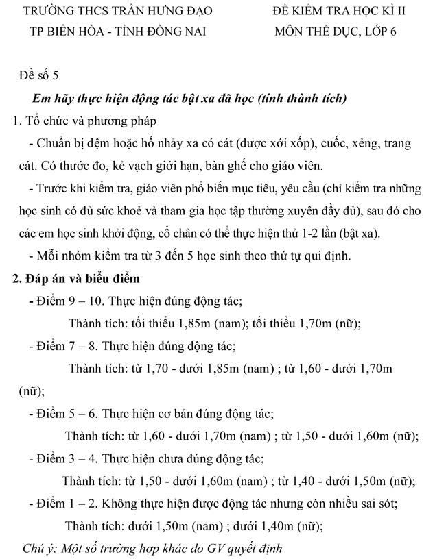 Đề kiểm tra học kì II lớp 6 môn Thể dục trường THCS Trần Hưng Đạo - Đồng Nai ( Đề 5)