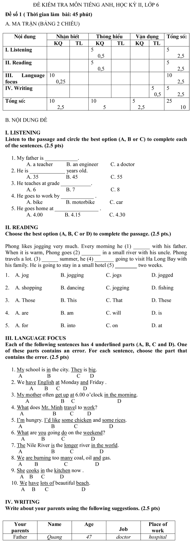 Đề kiểm tra môn tiếng Anh, học kì II, lớp 6 - Đề số 1