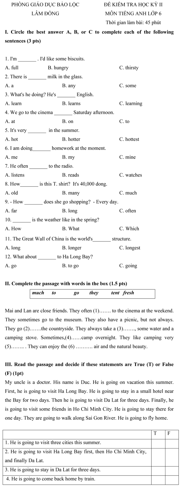 Đề kiểm tra học kì II lớp 6 môn tiếng Anh phòng Giáo dục Bảo Lộc - Lâm Đồng dưới đây sẽ giúp các em học sinh lớp 6 ôn thi học kì 2 hiệu quả. Mời các em tham khảo và làm đề thi học kì 2 môn tiếng Anh lớp 6 dưới đây.