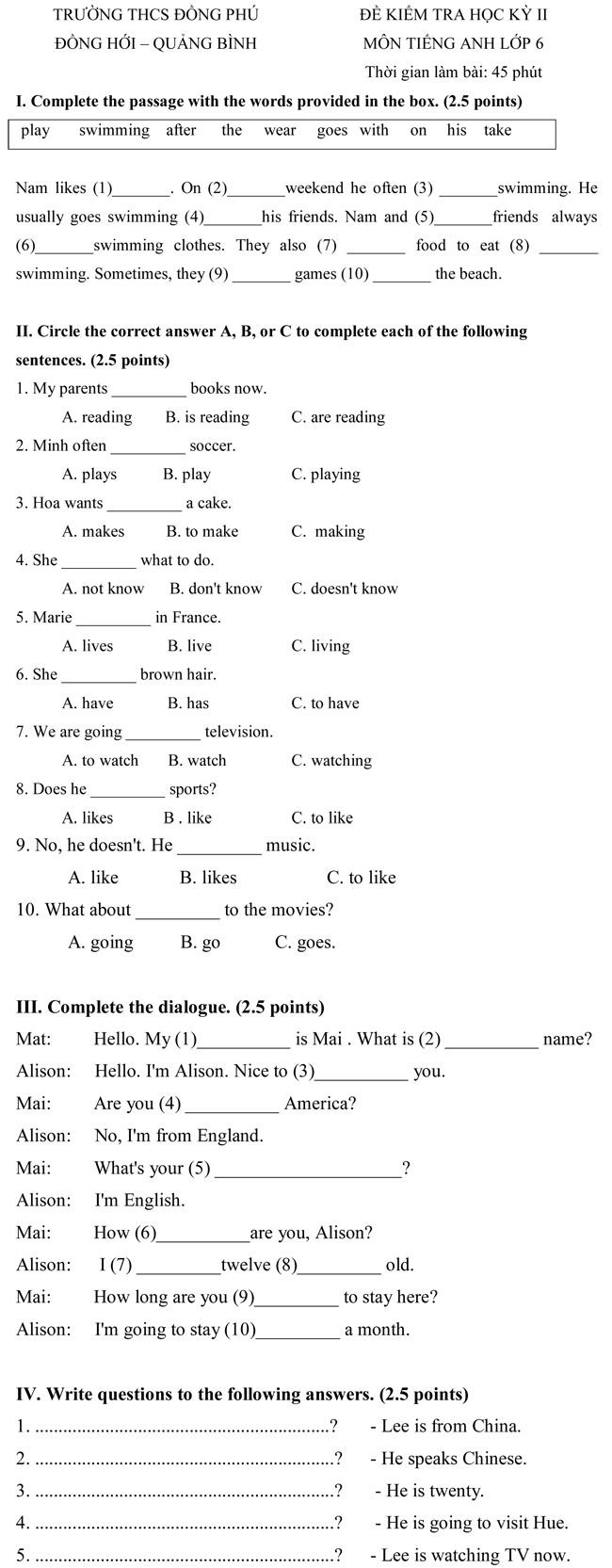 Đề kiểm tra học kì II lớp 6 môn tiếng Anh trường THCS Đồng Phú - Quảng Bình