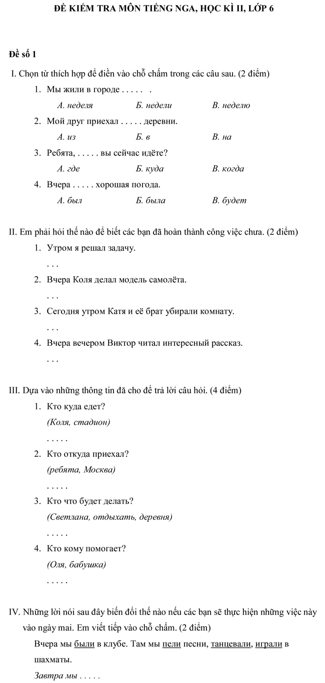 Đề kiểm tra học kì II dành cho học sinh THCS lớp 6 môn tiếng Nga - Đề số 1