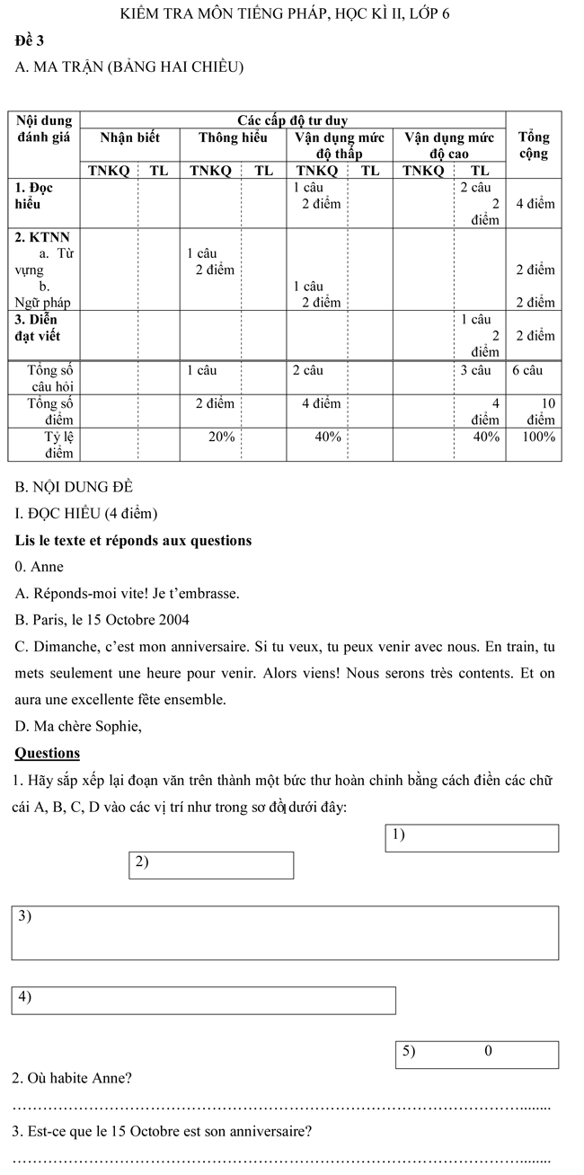 Đề kiểm tra học kì II môn tiếng Pháp dành cho học sinh lớp 6 - Đề số 1