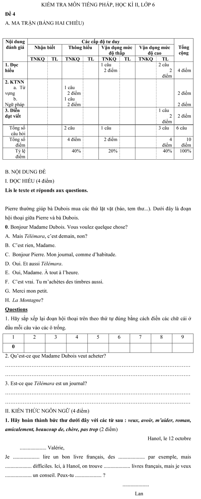 Đề kiểm tra học kì II môn tiếng Pháp dành cho học sinh lớp 6 - Đề số 2