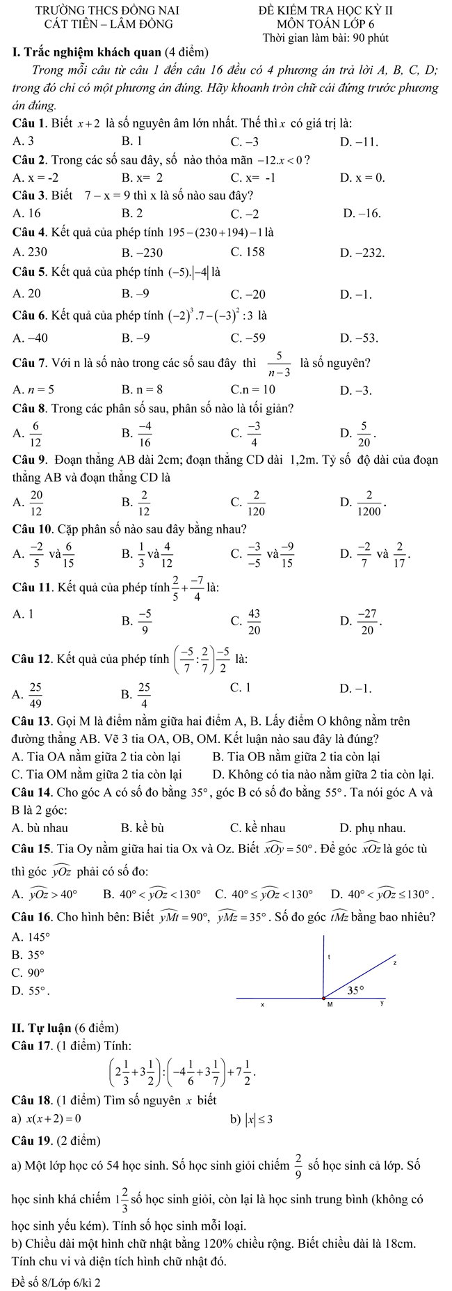 Đề kiểm tra học kì II môn Toán dành cho học sinh THCS lớp 6 (Đề 8) - Trường THCS Đồng Nai, Cát Tiên, Lâm Đồng