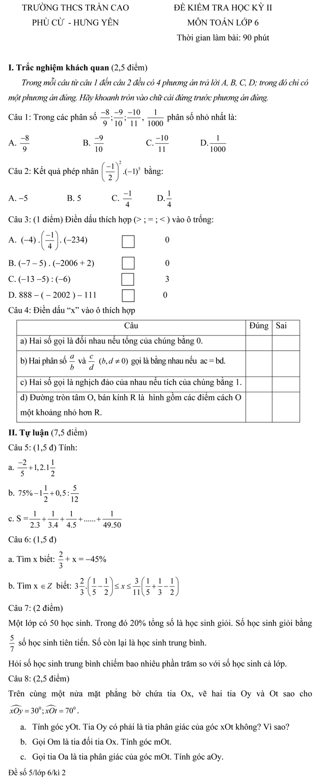 Đề kiểm tra học kì II môn Toán dành cho học sinh THCS lớp 6 (Đề 5) - Trường THCS Trần Cao, Phù Cừ, Hưng Yên
