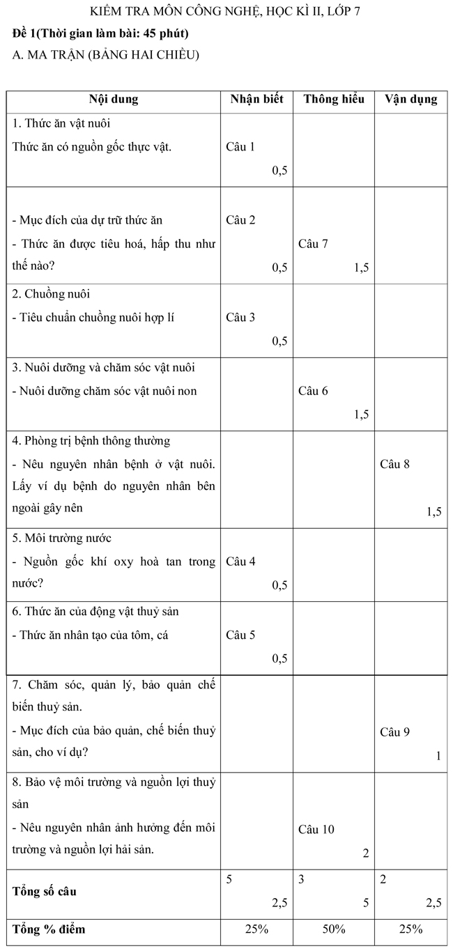Đề kiểm tra môn Công nghệ học kì II dành cho học sinh THCS lớp 7 - Đề số 1