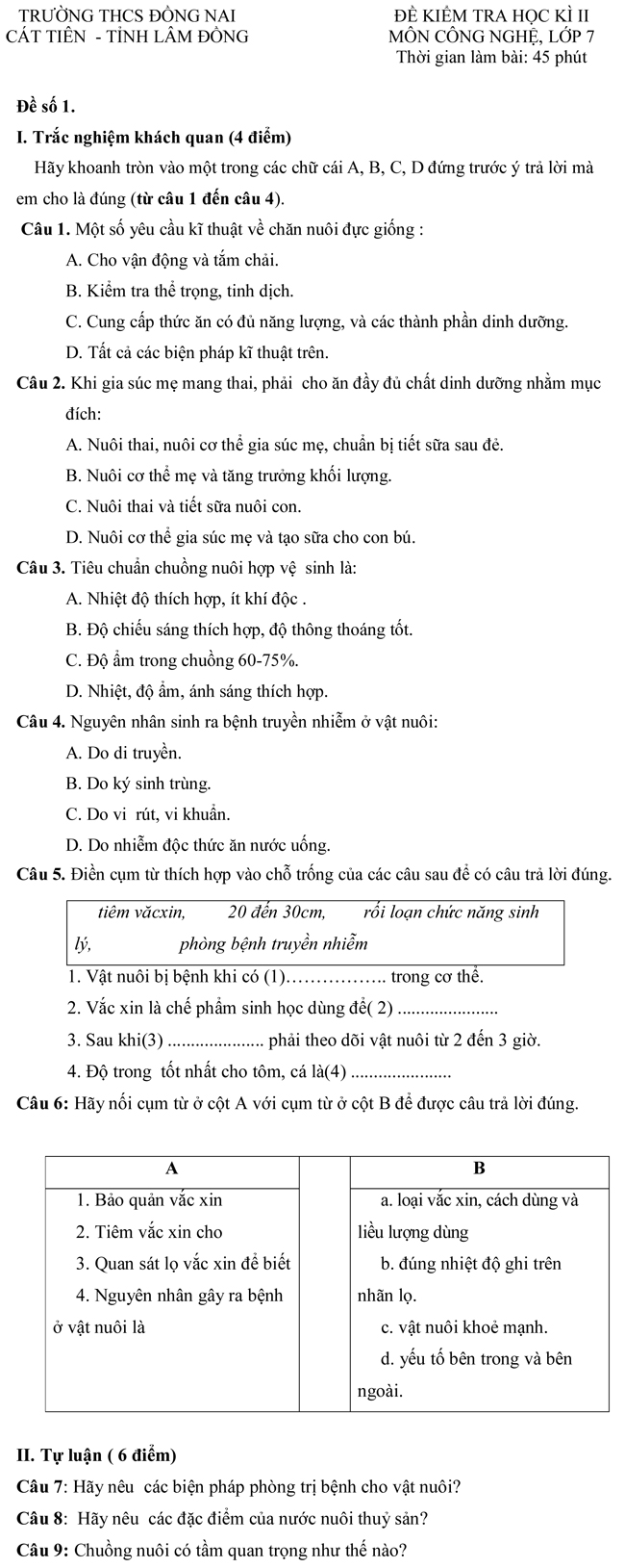 Đề kiểm tra học kì II lớp 7 môn Công nghệ - Trường THCS Đồng Nai, Lâm Đồng (Đề 1)