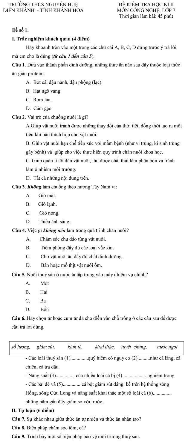 Đề kiểm tra học kì II lớp 7 môn Công nghệ - Trường THCS Nguyễn Huệ, Khánh Hòa (Đề 1)