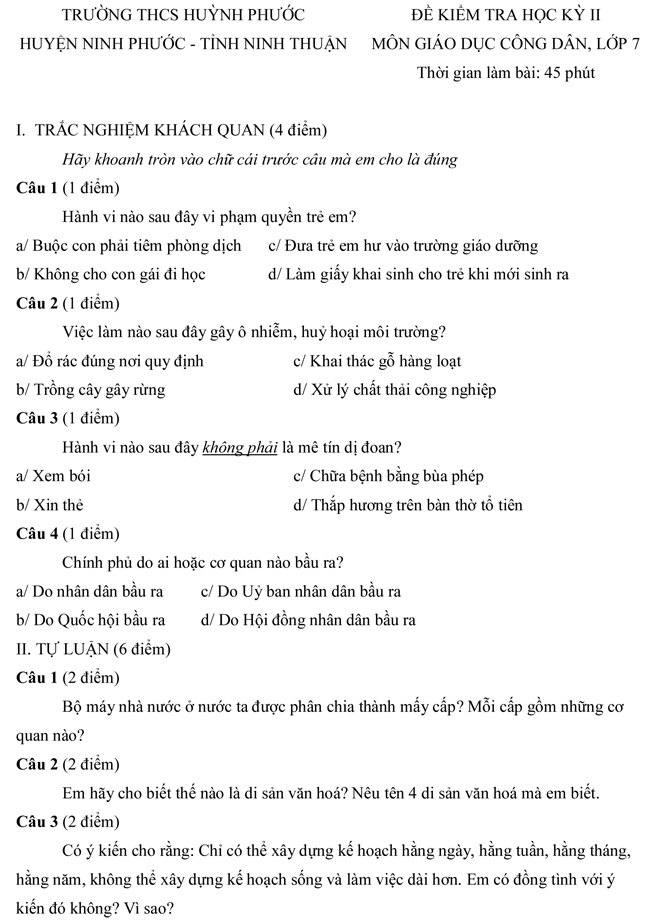 Đề kiểm tra học kì II môn Giáo dục công dân lớp 7 - Trường THCS Huỳnh Phước, huyện Ninh Phước, tỉnh Ninh Thuận