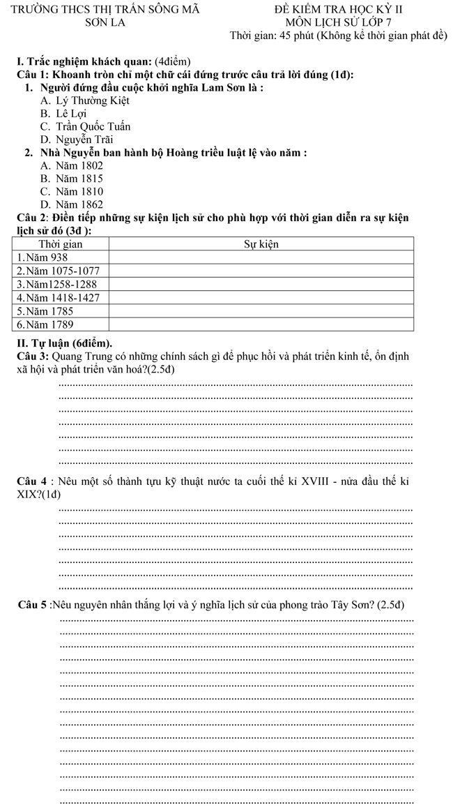 Đề kiểm tra học kì II môn Lịch sử lớp 7 - Trường THCS Thị trấn Sông Mã, Sơn La