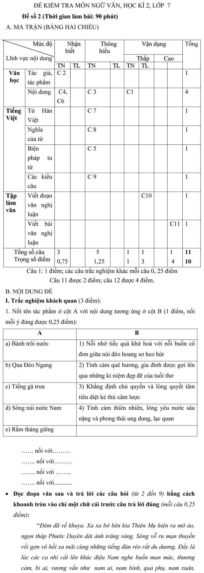 Đề kiểm tra học kì II môn Ngữ văn dành cho học sinh THCS lớp 7 - Đề số 2