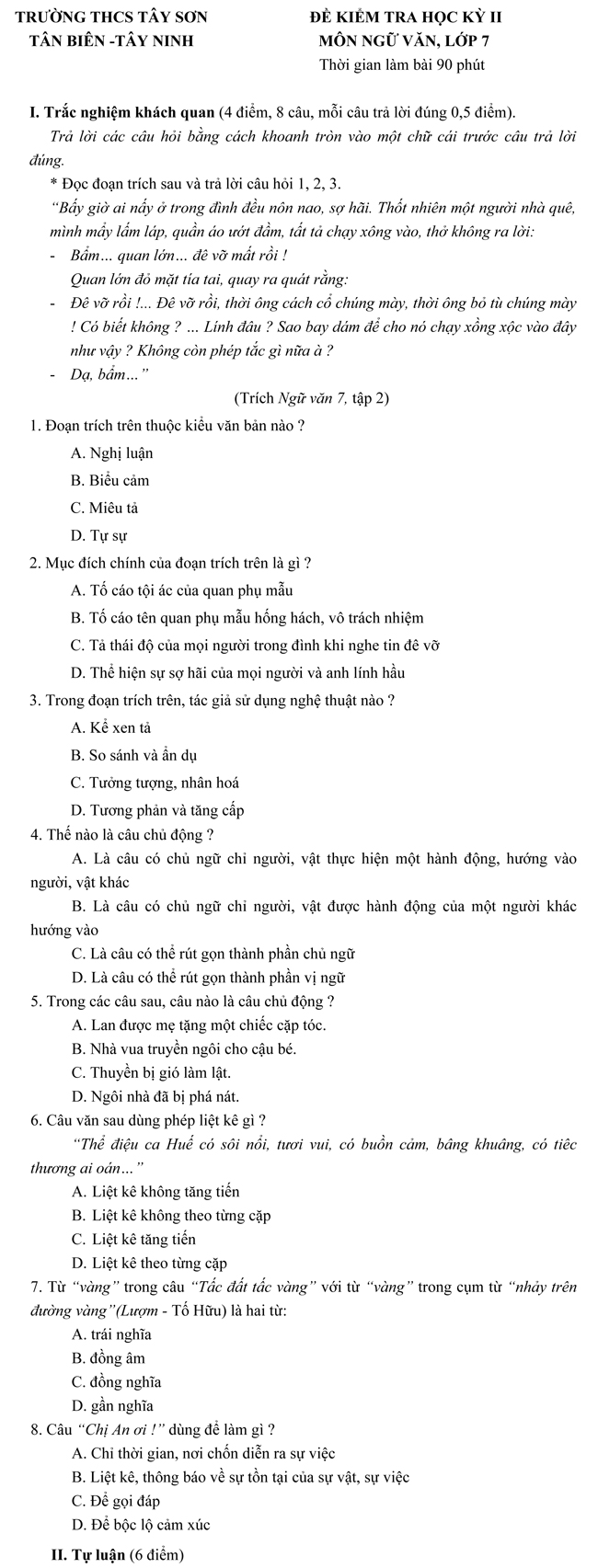 Đề kiểm tra học kì II lớp 7 môn Ngữ văn - THCS Tây Sơn, Tây Ninh (Đề 1)