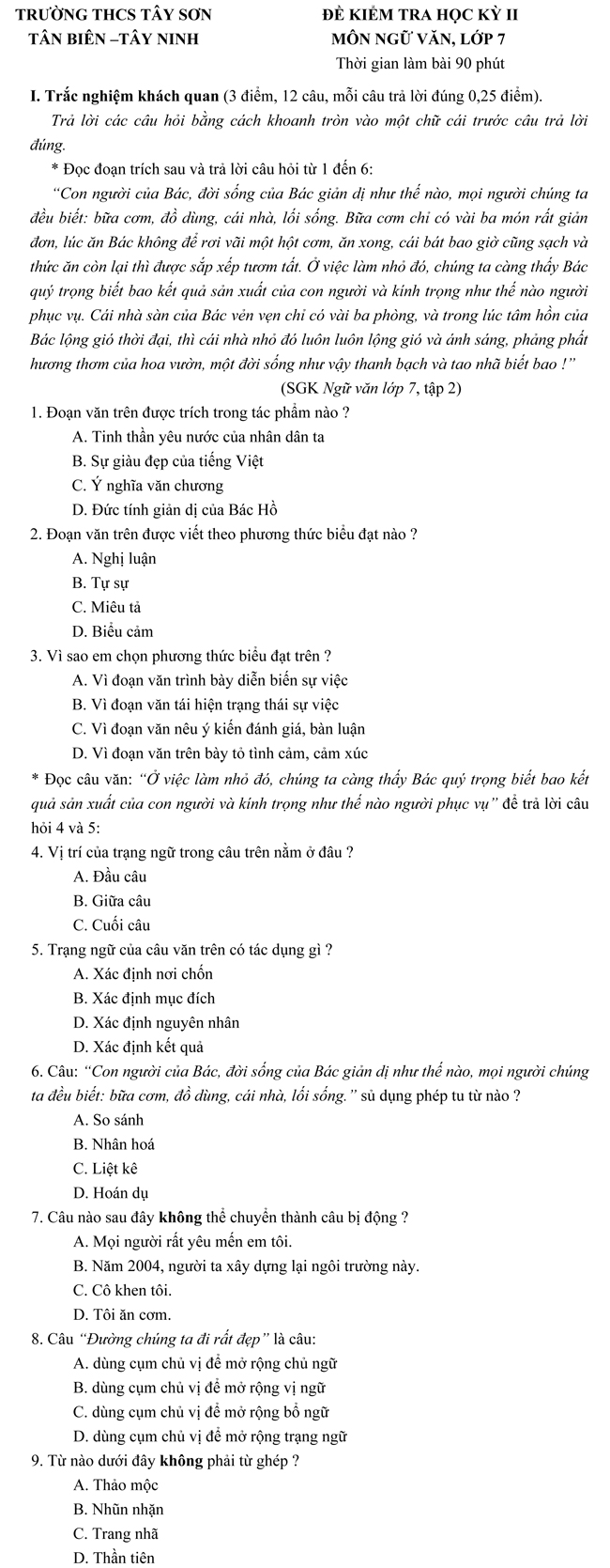Đề kiểm tra học kì II môn Ngữ văn lớp 7 dành cho học sinh THCS Tây Sơn, Tân Biên, Tây Ninh (Đề 2)