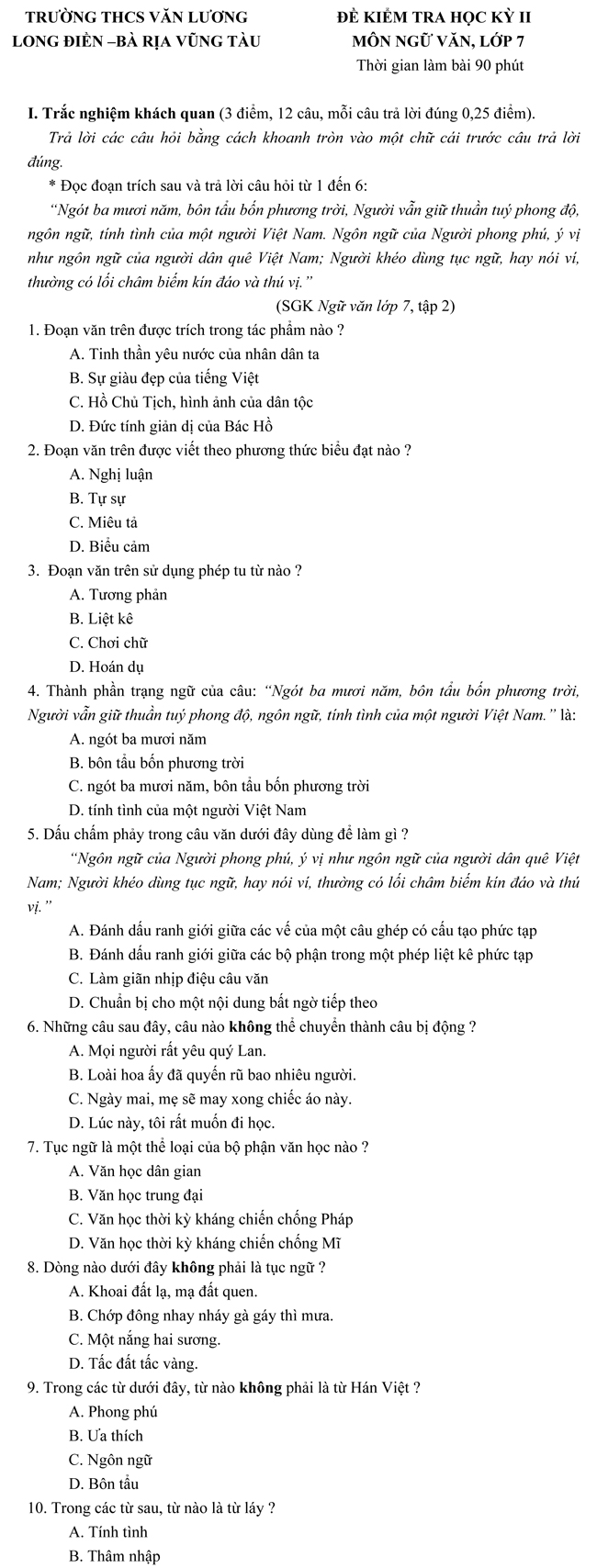 Đề kiểm tra học kì II lớp 7 môn Ngữ văn - THCS Văn Lương, Bà Rịa Vũng Tàu