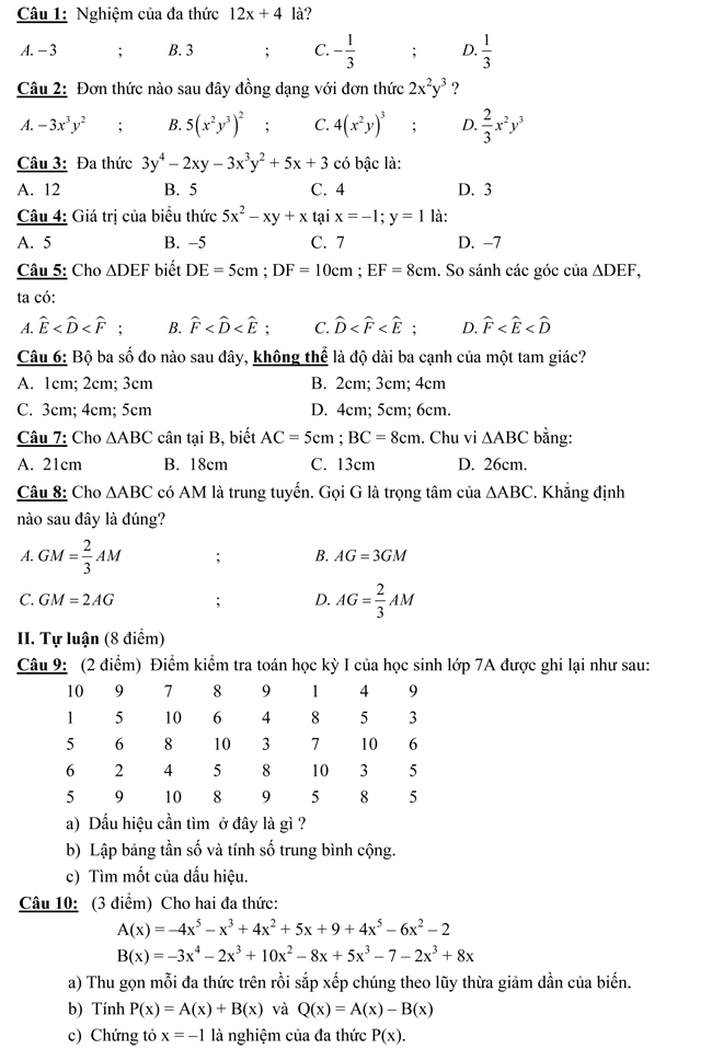 ĐỀ KIỂM TRA HỌC KỲ II MÔN TOÁN LỚP 7 |