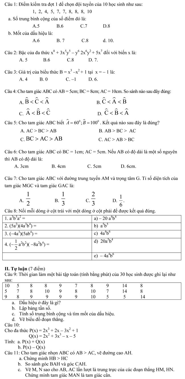 Đề kiểm tra học kì II lớp 7 môn Toán - Sở Giáo dục và Đào tạo Hưng Yên