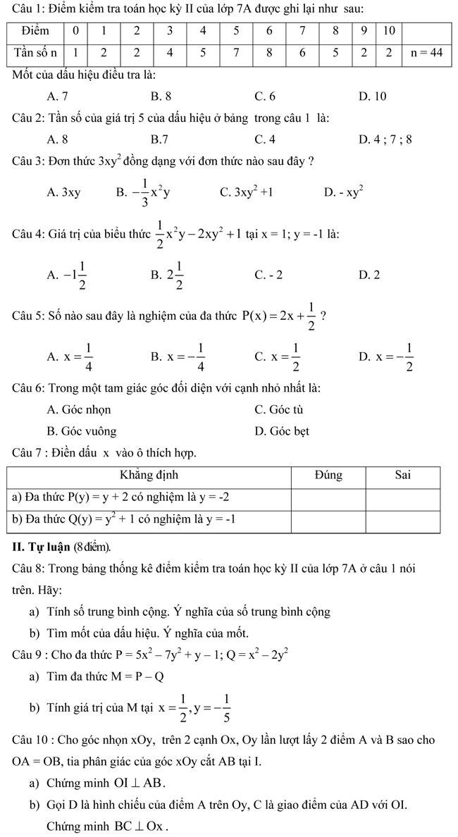 ĐỀ KIỂM TRA HỌC KỲ II MÔN TOÁN LỚP 7 |