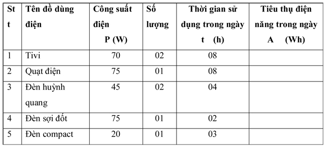 Câu 7. Một gia đình sử dụng các đồ dùng điện trong ngày như sau: