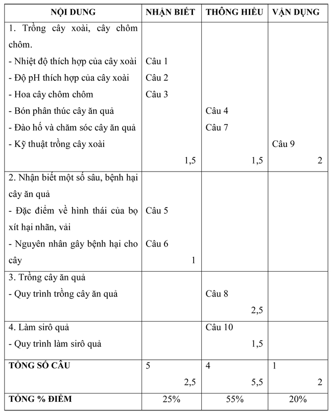 A. MA TRẬN (BẢNG HAI CHIỀU) MOĐUN TRỒNG CÂY ĂN QUẢ