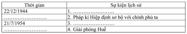 Câu 2: (1 điểm) Điền tiếp thời gian và sự kiện lịch sử tương ứng vào chỗ ... trong bảng sau cho đúng
