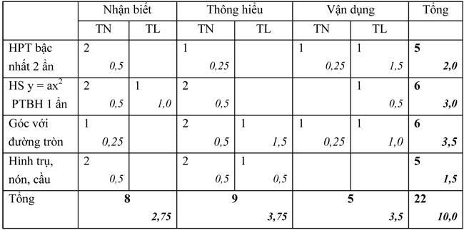 Chữ số phía trên, bên trái mỗi ô là số lượng câu hỏi; chữ số ở góc phải dưới mỗi ô là trọng số điểm cho các câu ở ô đó