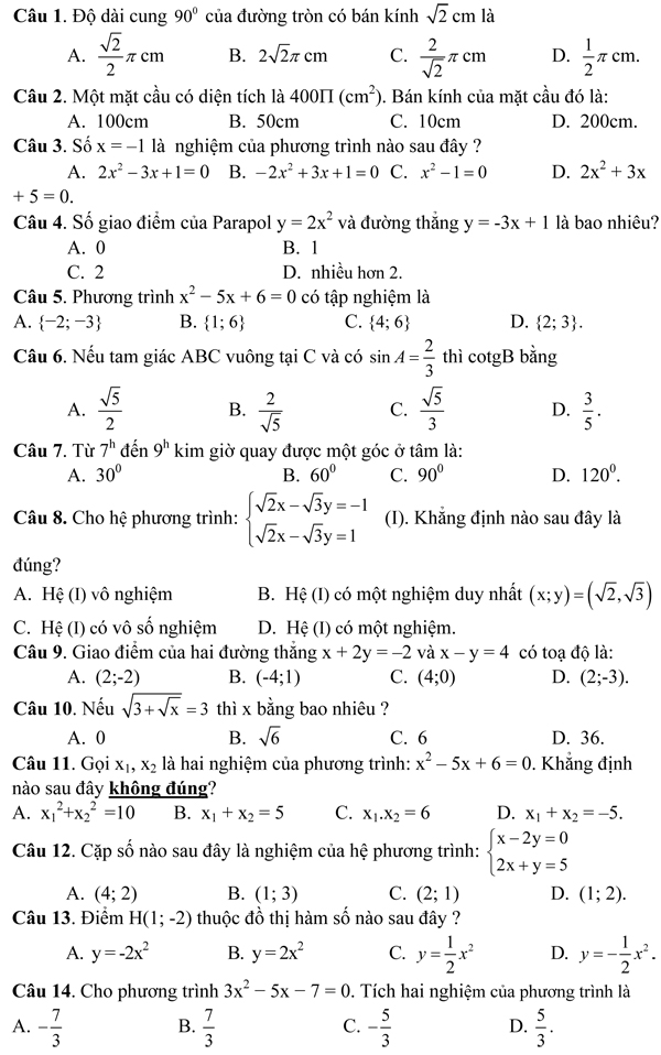 Trong mỗi câu từ câu 1 đến câu 14 đều có 4 phương án trả lời A, B, C, D; trong đó chỉ có một phương án đúng. Hãy khoanh tròn vào chữ cái đứng trước phương án đúng.