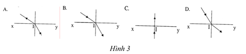 6. Trong hình 3, xy là mặt phân cách giữa hai môi trường không khí (ở trên) và nước (ở dưới). Hình nào biểu diễn không đúng sự khúc xạ của tia sáng khi truyền qua mặt phân cách xy?
