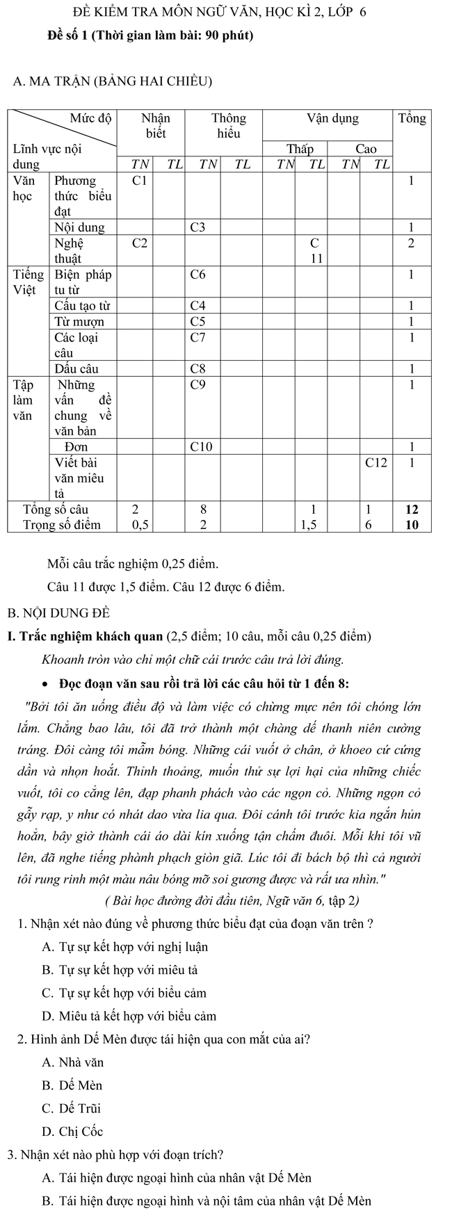 Đề kiểm tra học kì II môn Ngữ văn lớp 6 - Đề số 1