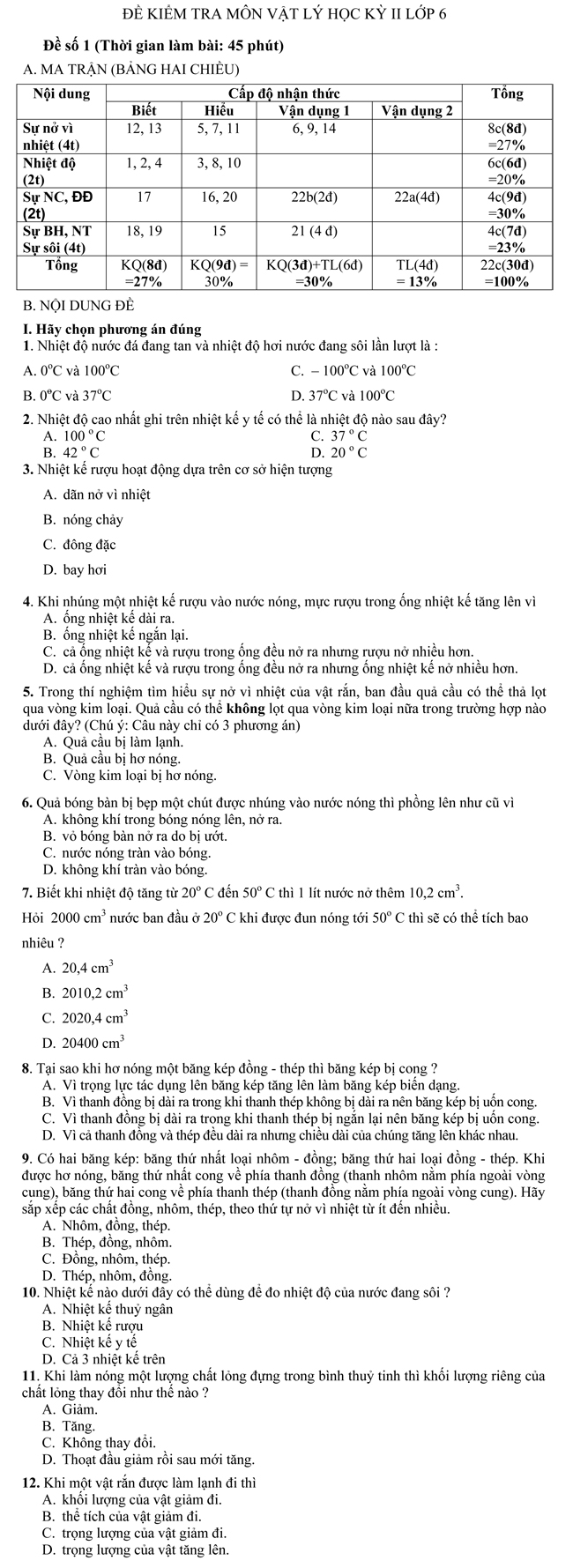 Đề kiểm tra học kì II môn Vật lý lớp 6 - Đề số 1